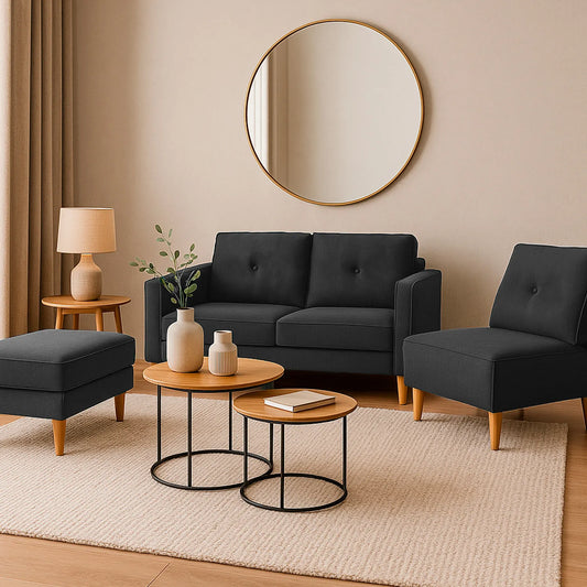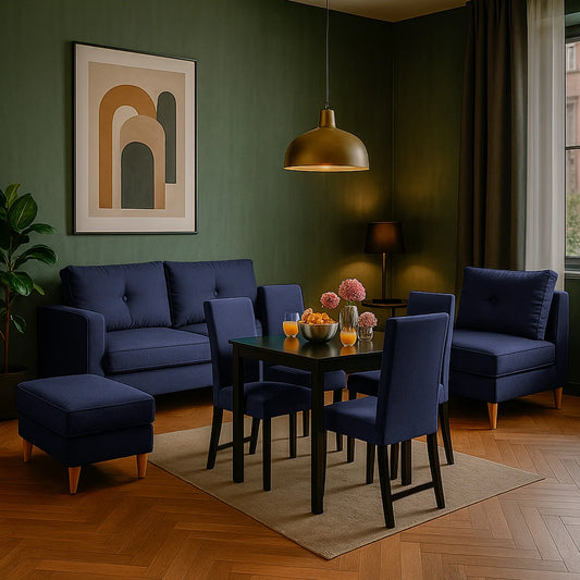 Juego de sala Plutón: Sofá 2 Pts, Comedor 4 Pts y Baúl Tapizado